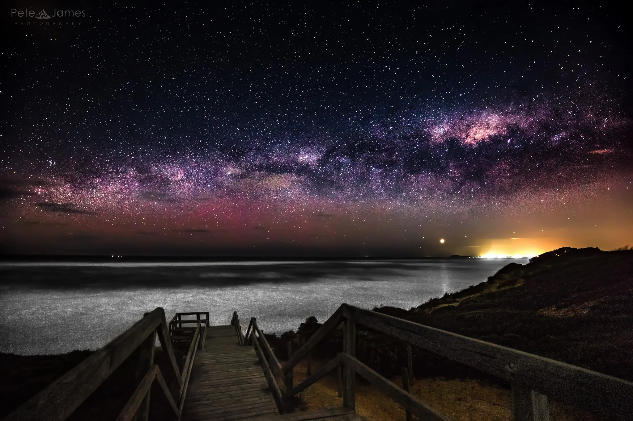 The red on the horizon is faint aurora lights, the bight lights to the right are from the Barwon Heads township and the bright light in the sky above the Bluff is Jupiter.