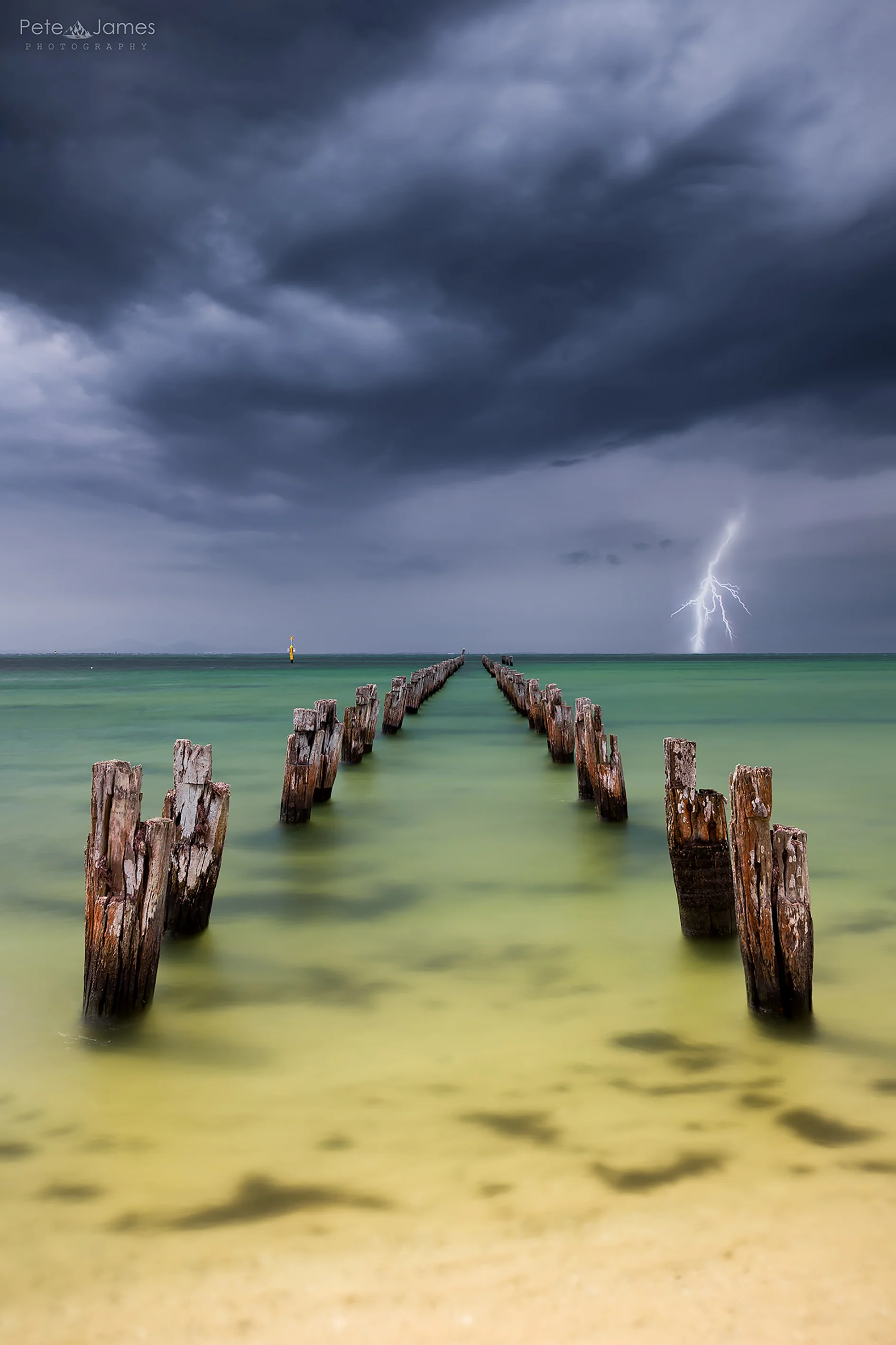After getting some shots of the first storm cell come across the coast near Barwon Heads, I was watching the radar closely trying to work out where this next cell would track and where would be the best place to photograph it. I was in Ocean Grove when I noticed this cell was coming across further north so i raced up to Clifton Springs. I hadn't seen much lightening in the morning storm cell unfortunately so i was hoping this one would produce the goods. There was a break in the clouds just long enough for the sun to shine through and illuminate the beautiful green water this place is renowned for.