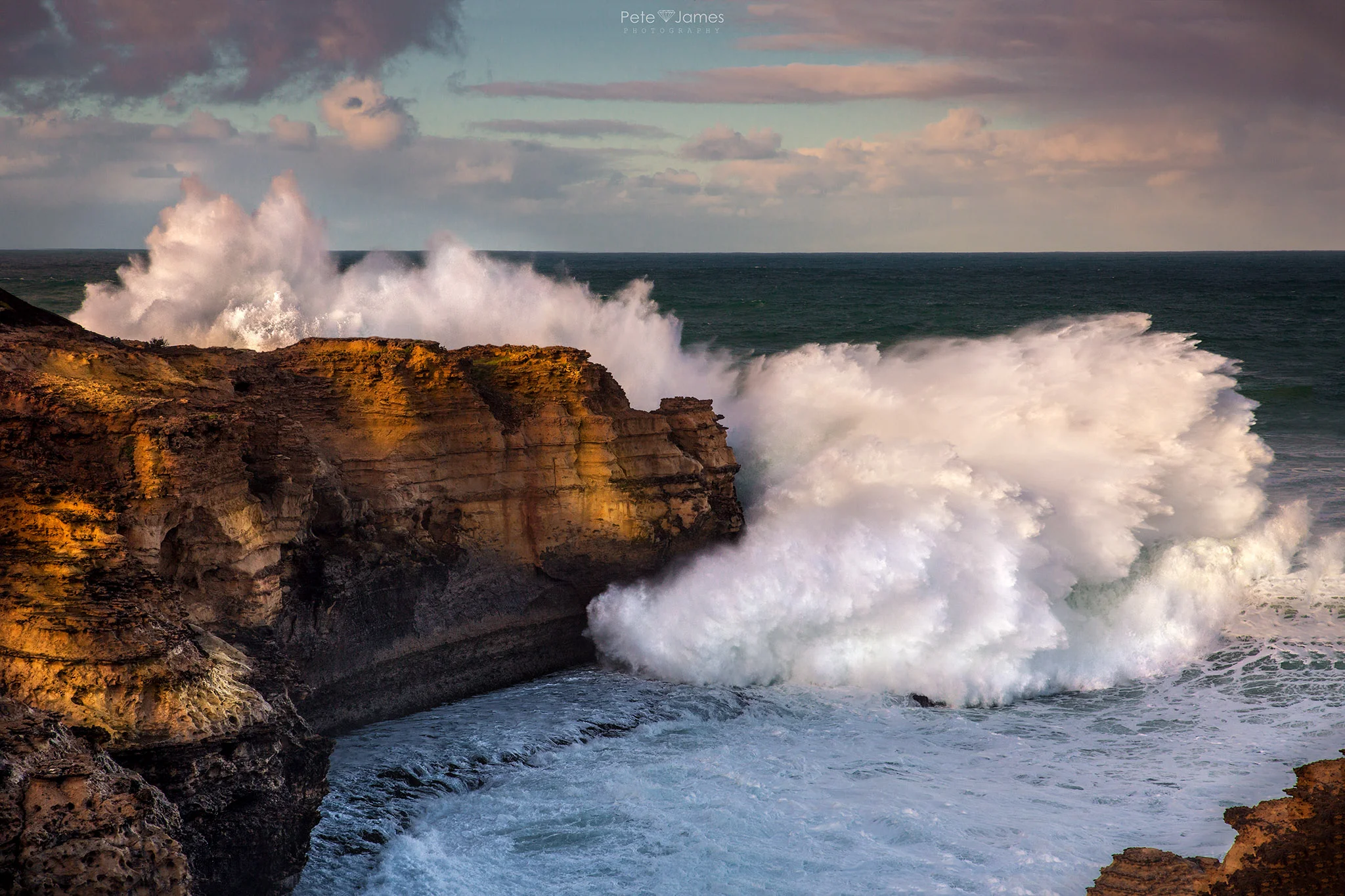 Yesterday afternoon I was sitting in my gallery in Geelong and was watching the forecast for a very large swell about to hit the Victorian coastline. I decided to close shop early and head down the coast to see the swell myself and try and capture it. Last night was reasonably big but nothing too exciting. The swell built overnight though and was incredibly big and stormy this morning. The sheer power of the waves exploding against the ancient cliffs was so intense you could almost feel the ground shake as they hit the cliffs. There were a couple of hairy moments with the waves coming up onto the clifftop where I was shooting from, having to run a couple of times and got the camera a bit wet too.
